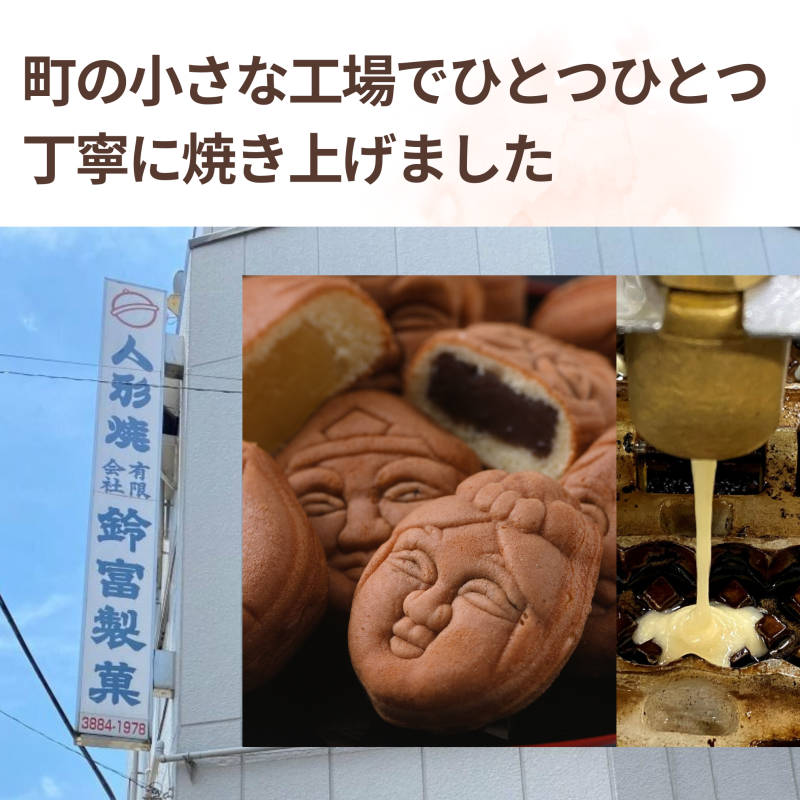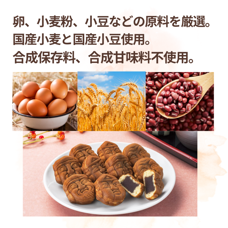 Moist, moderately sweet ningyo-yaki made with domestic wheat and Hokkaido red beans.