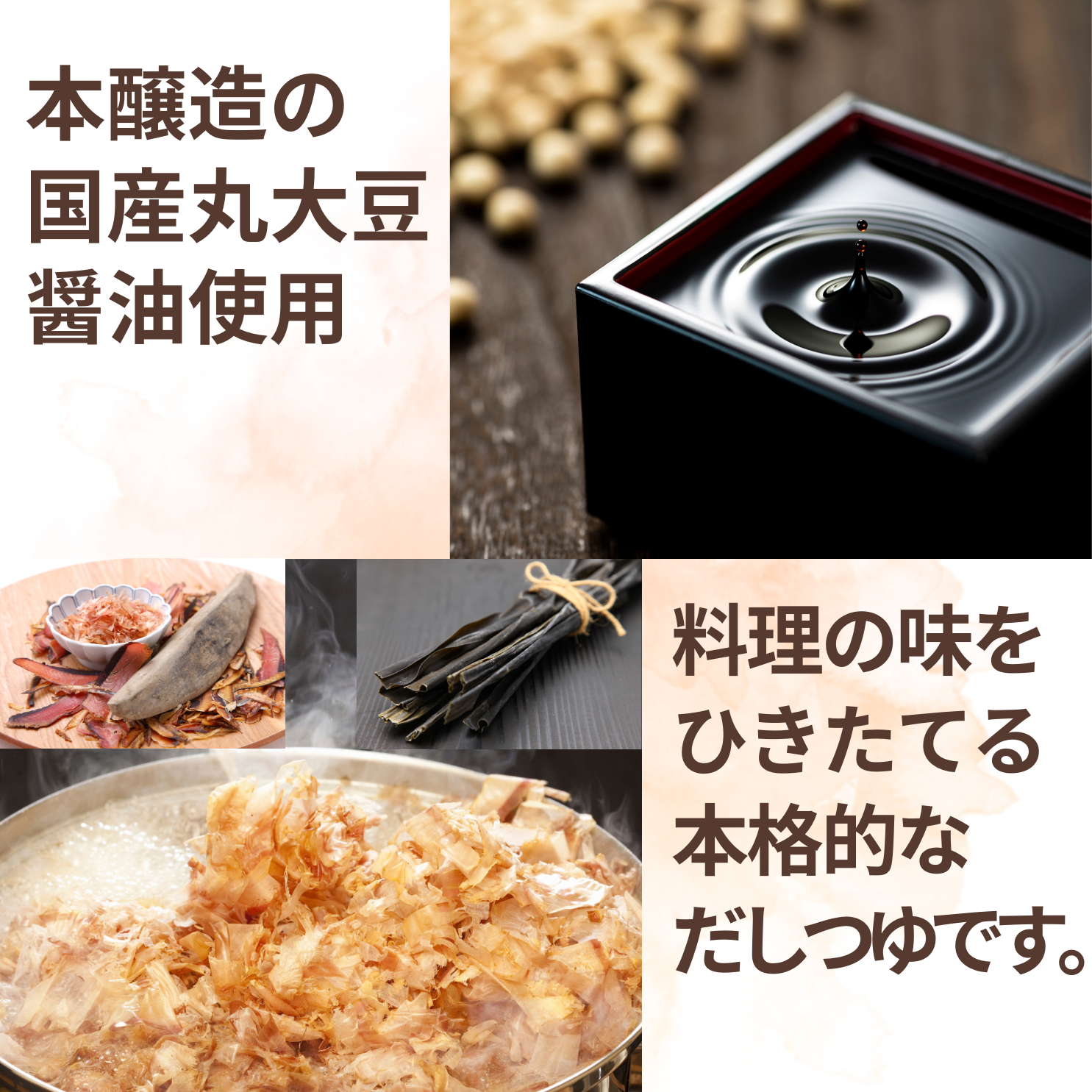 An authentic dashi soup made with bonito flakes and kelp. Can also be used as a dipping sauce.