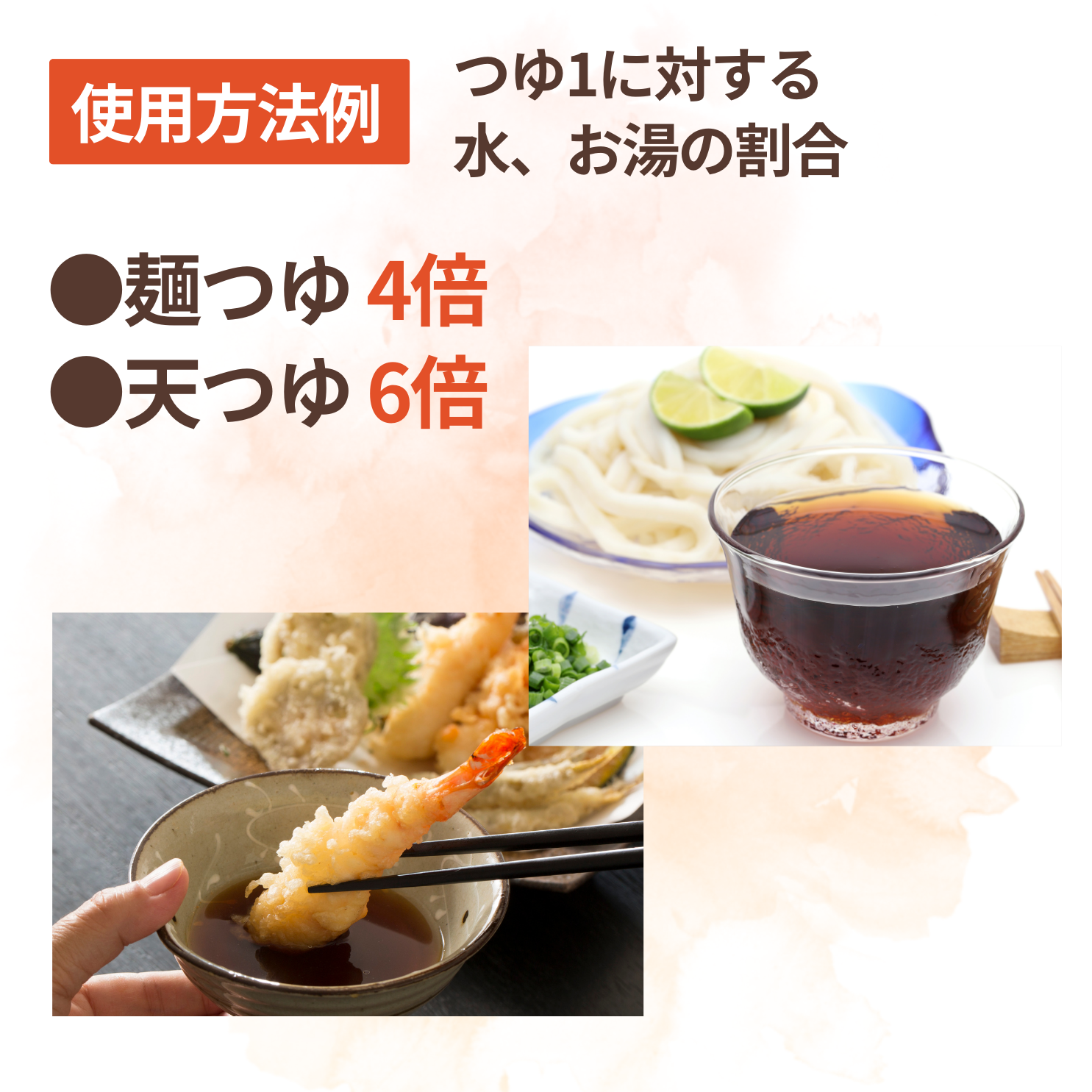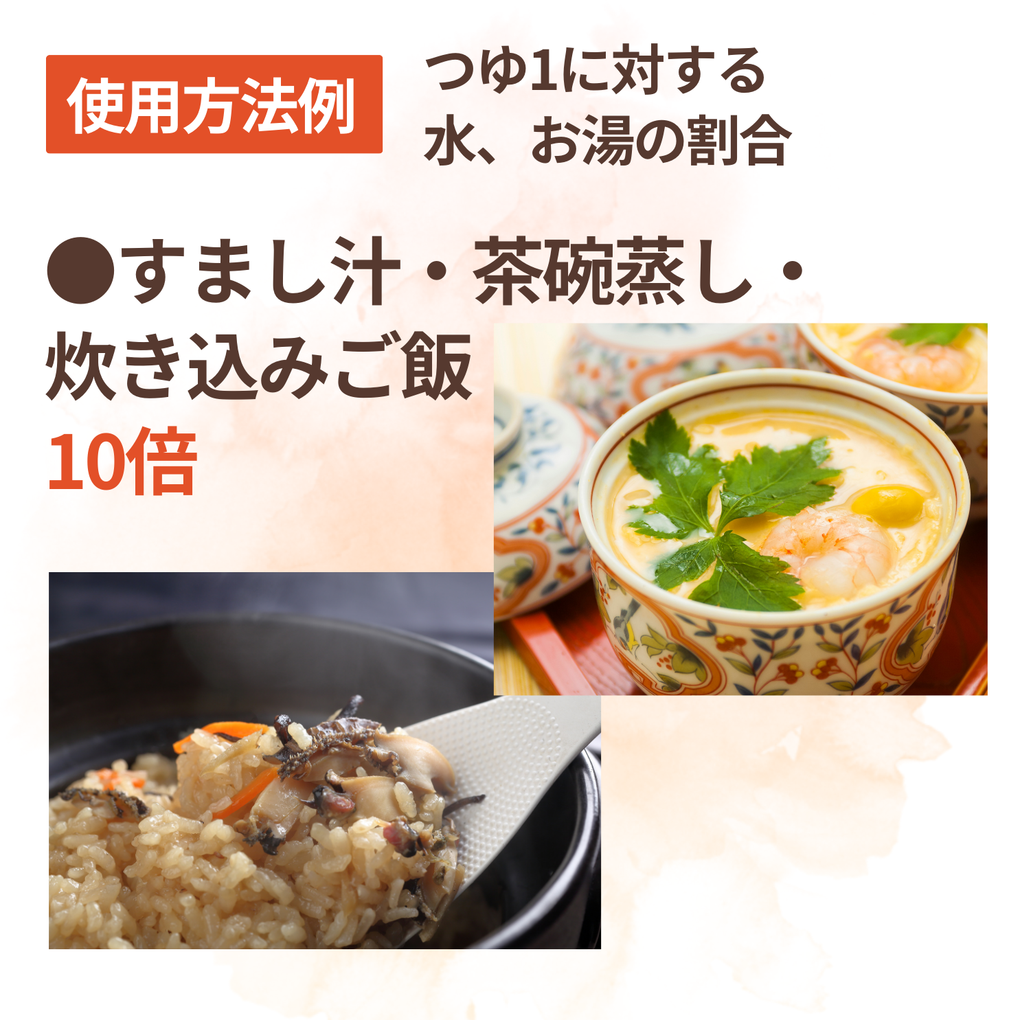 ●Simmered food: appropriate amount ●Noodle soup: 4 times ●Tempura sauce: 6 times ●Clear soup, chawanmushi, and cooked rice: 10 times