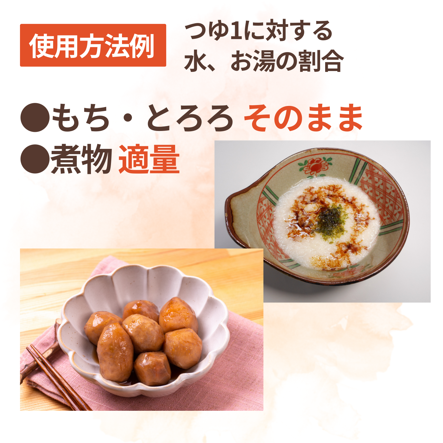 Usage example: 1 part soup stock to water or hot water ratio ● Mochi and grated yam as is