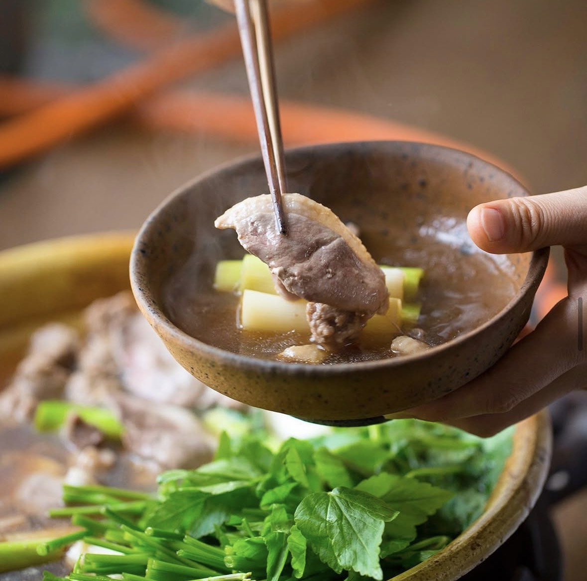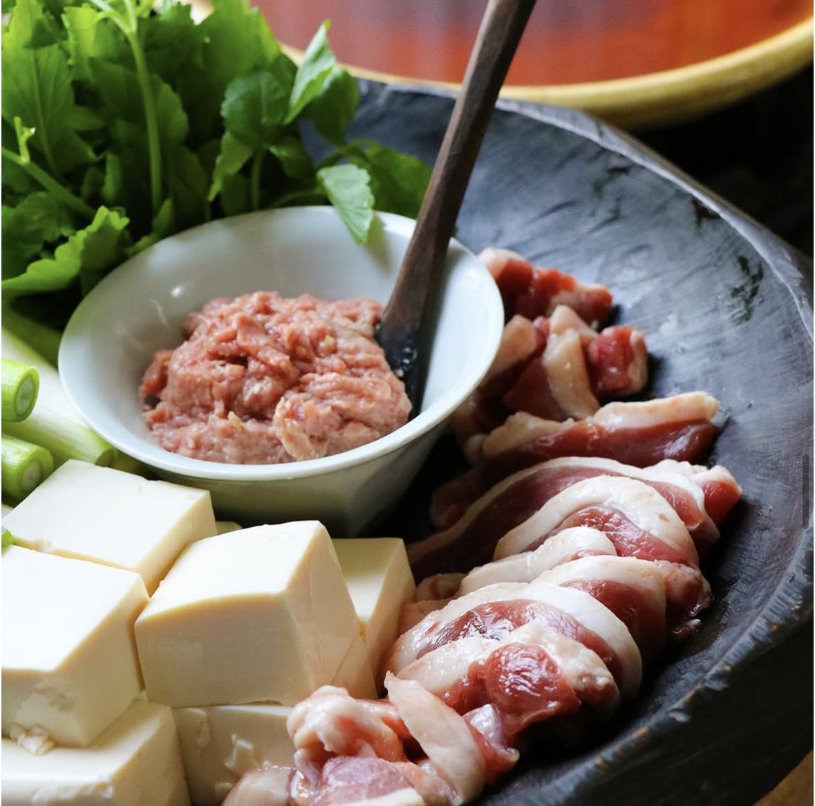 冬限定の一湖房お鍋が今年もおすすめです。飼育日数を長くし、旨みを増した合鴨肉をご用意いたしました。、つみれは「親鴨」と「若鴨」を合わせてミンチを作り、たまごの代わりに長芋と刻みネギ、少々の塩と小麦粉を練り込みました。出汁は合鴨のガラなどからとった出汁をベースに、あっさりしているけれど、コクのある味に仕上げました。まず、つくねと角切りのもも肉を入れると、上質の透き通った油がうっすら浮かんできます、そこにネギや旬の野菜や豆腐を入れ、鴨のスライス(胸肉)をしゃぶしゃぶしてお召し上がりください。