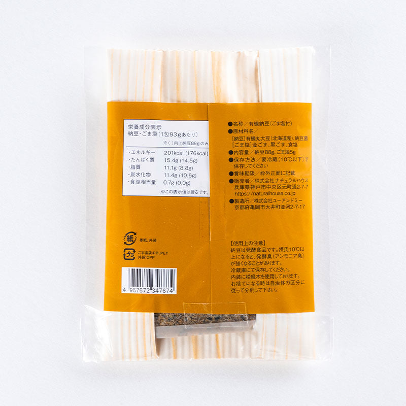 「親父がナチュラルハウス。日本一小さな納豆屋」生産者特定北海道有機大粒大豆ユウキホマレをセイロで蒸して豆の甘みを引き出しました。(ごま塩付き)