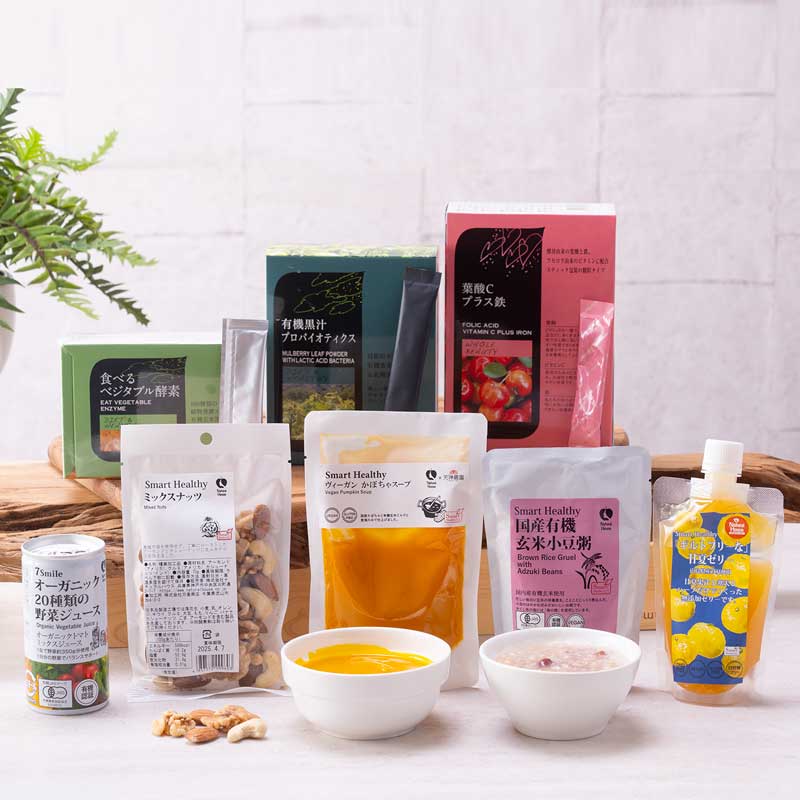有機20種類野菜ジュース 1本(190g)、ミックスナッツ 1袋、ヴィーガンかぼちゃスープ 1袋(140g)、有機玄米あずき粥 1個(200g)、ギルトフリーな甘夏ゼリー 1個(140g)、有機黒汁プロバイオティクス 1包(3g)、食べるベジタブル酵素 1包(5g)、葉酸Cプラス鉄 1包(2g)、1dayファスティング食事順チラシ